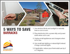 These 5 Ways to Save tip sheets provide instructions on how to save energy and water in different locations on an installation. They can be distributed in print or digitally, and demonstrate simple steps Marines and their families can take to be more energy efficient.