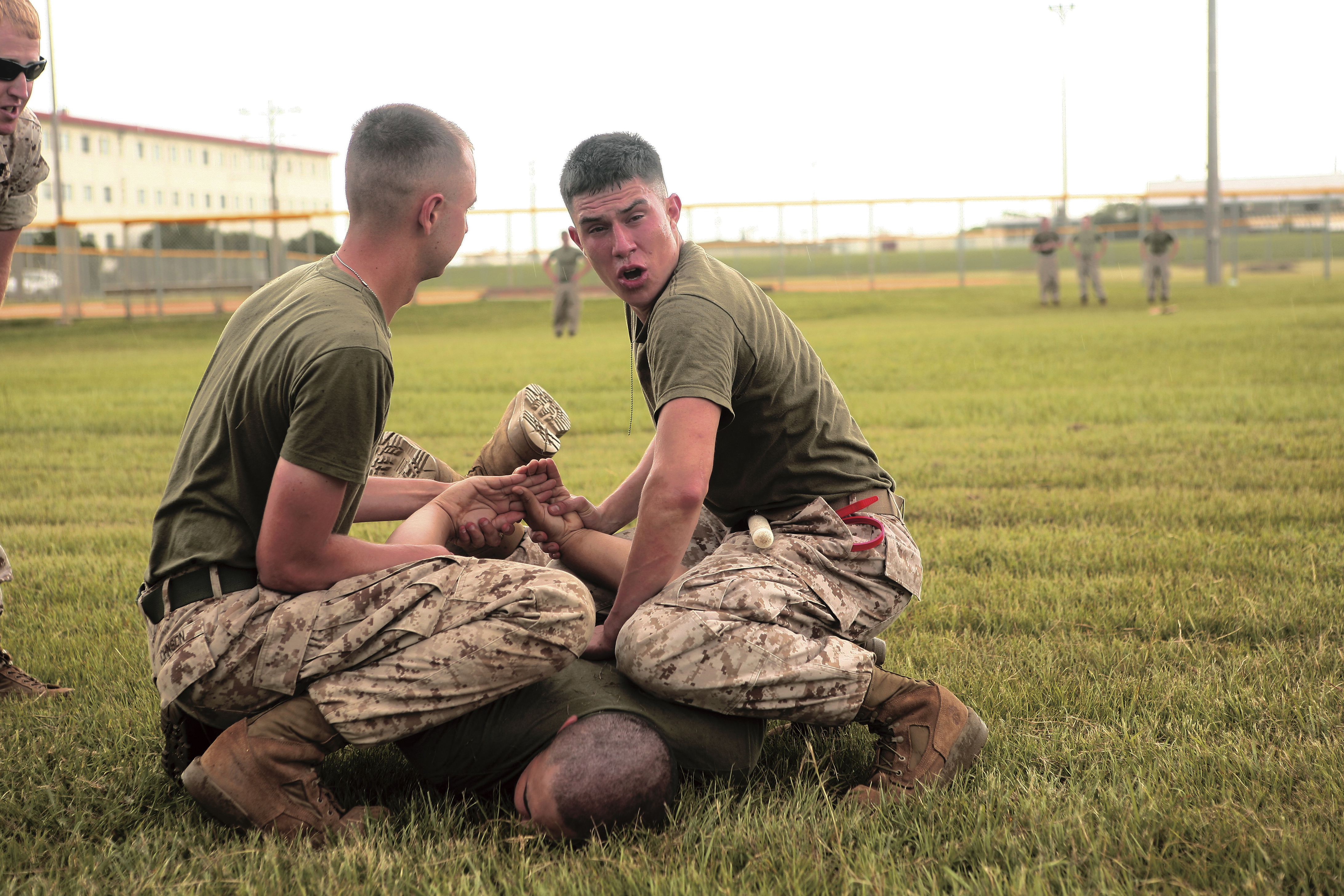 Lance Cpl. Terry Martin, a maintenance management specialist with 3rd Intelligence Battalion, III Marine Expeditionary Force, subdues a mock attacker with the help of Lance Cpl. Joshua Johnson, a special intelligence systems administrator and communicator, 3rd Intel. Bn., during an Oleoresin Capsicum Level-1 contamination course on Camp Hansen, June 23.